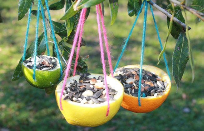un’arancia: per la sua realizzazione è sufficiente dividere un’arancia a metà e svuotarne una parte del contenuto, semplicemente facendo una spremuta e ponendo attenzione a non rompere la buccia. La buccia stessa diverrà il contenitore per il vostro mangime per uccelli, da riempire a piacere e da appendere al ramo di un albero con uno spago robusto.