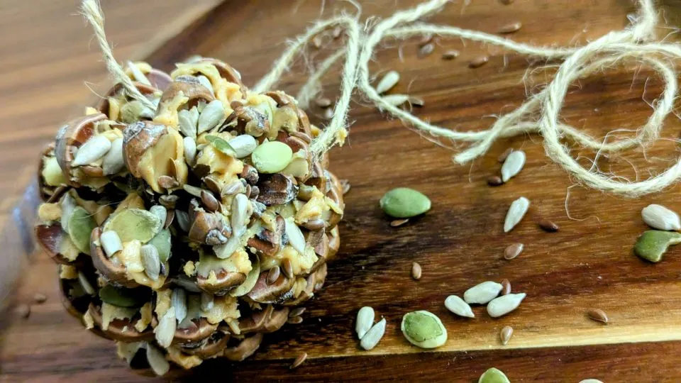 una pigna: spalmate in ogni lamella della pigna un velo di burro di arachidi. Passate la pigna nei semi misti in modo che restino attaccati al burro. Fissate la pigna all’estremità utilizzando il filo di cotone ed appendetela in un posto asciutto e riparato all’esterno.