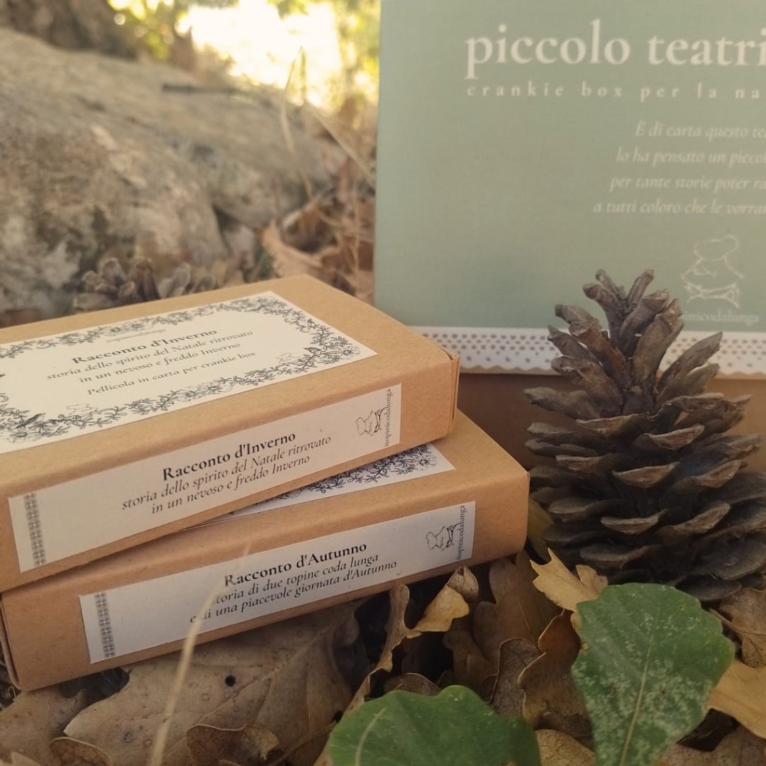 Una crankie box in cartone, 20x20cm, con manopole in legno alle quali viene applicata la pellicola del racconto, una lunga striscia di carta su cui sono stampate le illustrazioni, che nasce dalla necessità di ingrandire le illustrazioni durante le letture ad alta voce dei Topini Coda Lunga.