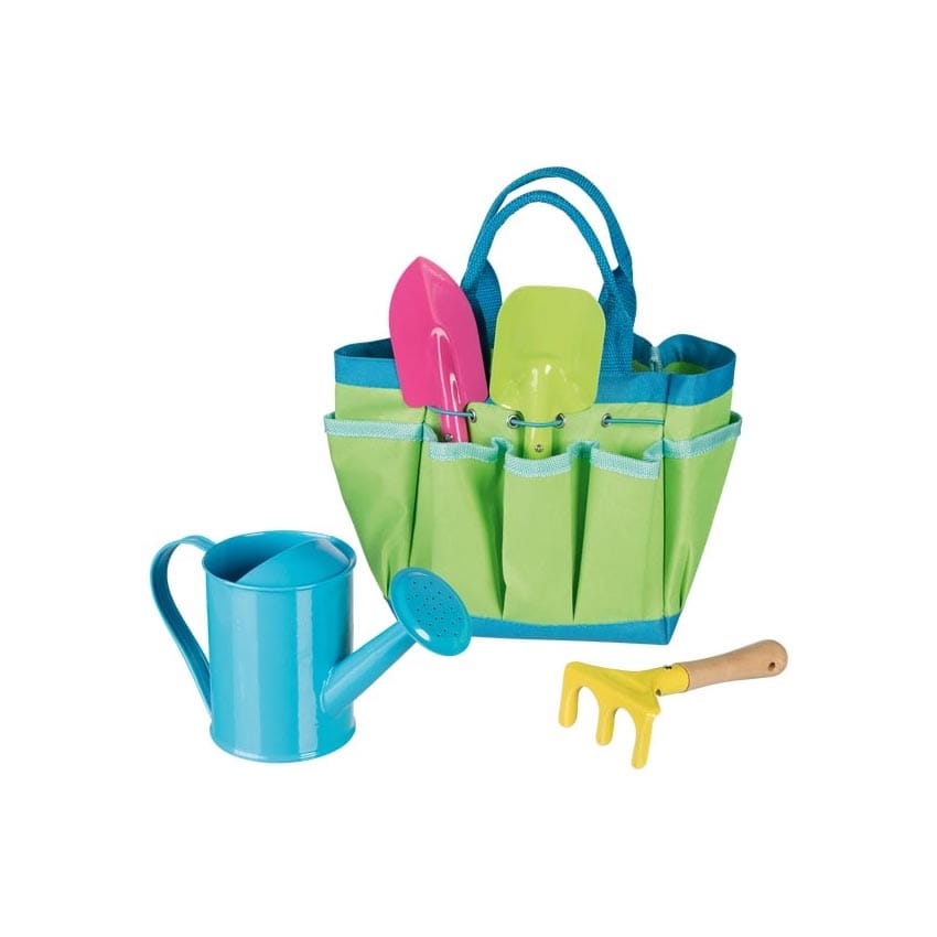Una prtaica e colorata borsa con tutti gli attrezzi di cui i bambibi hanno bisogno per lavorare nel proprio giardino o orto.