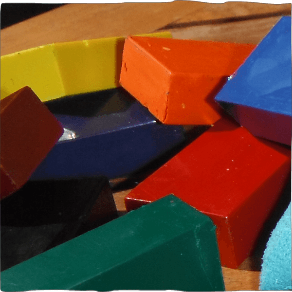 I mattoncini di cera hanno eccezionali proprietà di disegno. Si possono usare sia dalla parte dei lati, per colorare superfici ampie, sia dallo spigolo, per fare dei dettagli.